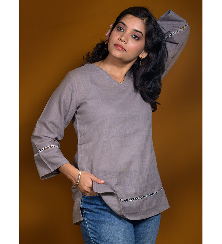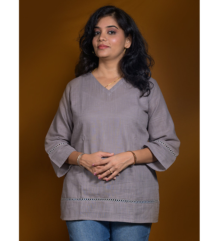 Plain V neck Short kurta Length of the Kurta is 28 inch 3/4 Sleeves with Crochet Lace Fabric is pure cotton colour - Grey