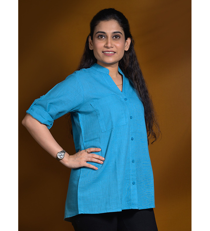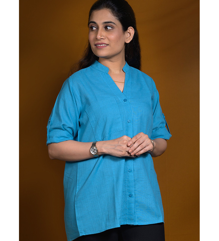 Plain Stand Collar Shirt Length of the Shirt is 28 inch 3/4 Sleeves with roll up button Fabric is pure cotton colour - Steel Blue